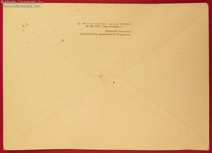 The size is 6 ¼" x 4 ½", published by the Ministry of Communications of the USSR, circulation unknown. The obverse features a large special-issue postal stamp showing the emblem of the Olympic Equestrian Sports competition, canceled with the First Day stamp issued by the Moscow Post Office and dated 22 September 1977. The artwork on the left side of the obverse is identical to the graphics of the stamp.