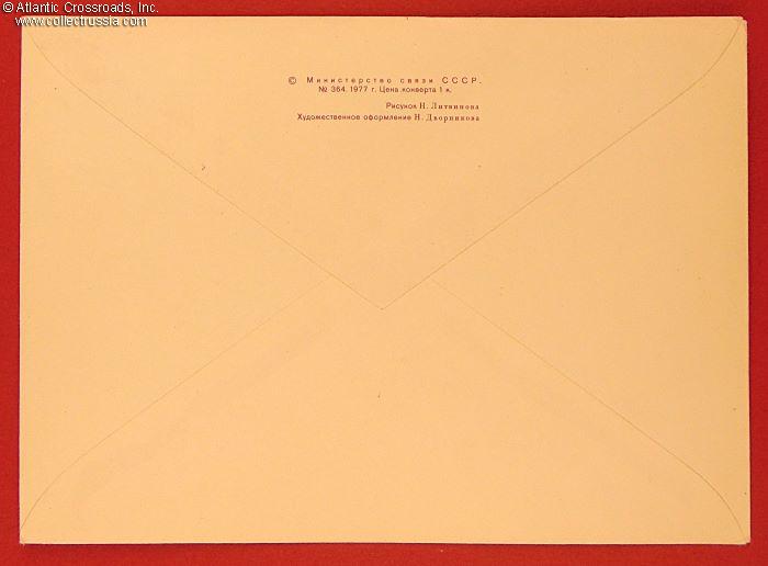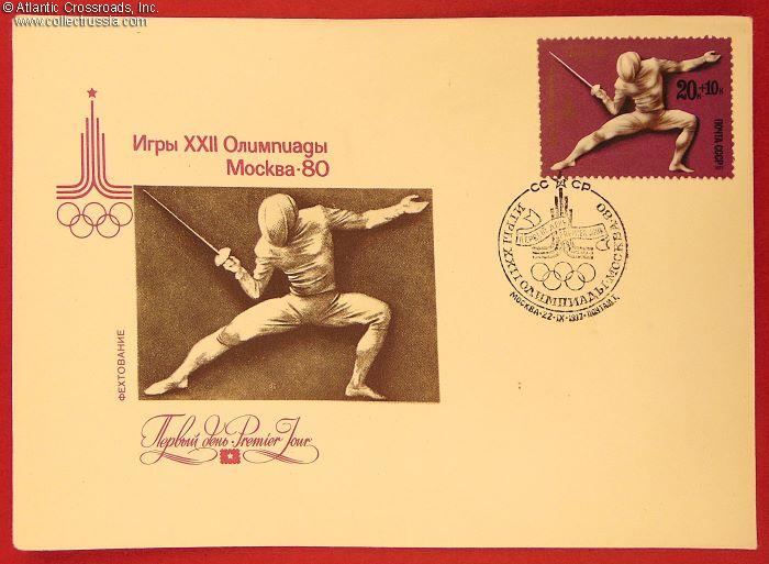 The size is 6 ¼" x 4 ½", published by the Ministry of Communications of the USSR, circulation unknown. The obverse features a large special-issue postal stamp showing the emblem of the Olympic Fencing competition, canceled with the First Day stamp issued by the Moscow Post Office and dated 22 September 1977. The artwork on the left side of the obverse is identical to the graphics of the stamp.
