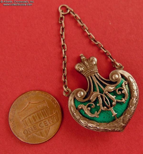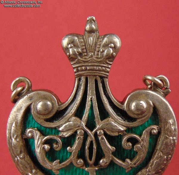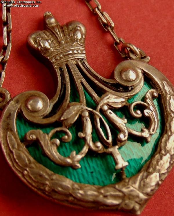 Silver, solid gold (superimposed Railroad emblem on the reverse), enamels. Measures 21.8 mm in height not including the attachment chain, 36.0 mm in width; weighs 13.6 g incl. the chain. Massive (for its size) and beautifully detailed. The obverse shows the cypher of Emperor Alexander I superimposed on an emerald-green enameled background with a guilloche pattern underneath. The scrolls along the edge in the upper portion immediately below the crown are accented with darker green enamel. On the reverse, the Russian railroad emblem of anchor and axe is a separate superimposed p