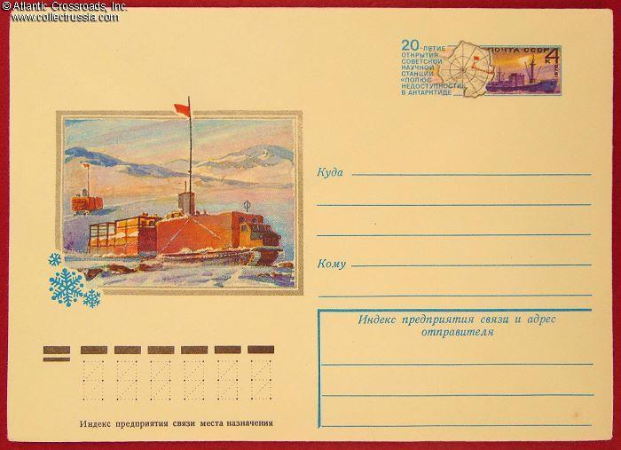 The size is 6 ¼" x 4 ½", postally unused, published by the Ministry of Communications of the USSR, circulation unknown. The special-issue pre-printed postal stamp features the location of the station on the map. The lettering to the left reads "20th anniversary of the opening of the Soviet science station "Pole of Inaccessibility" in Antarctica."