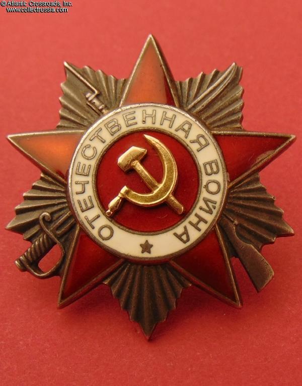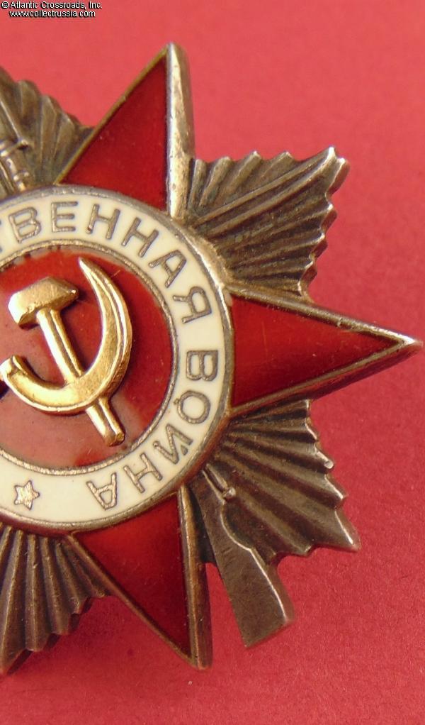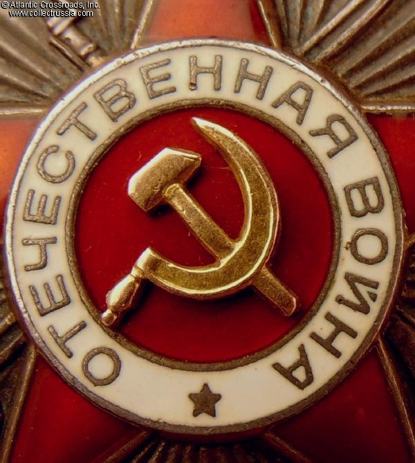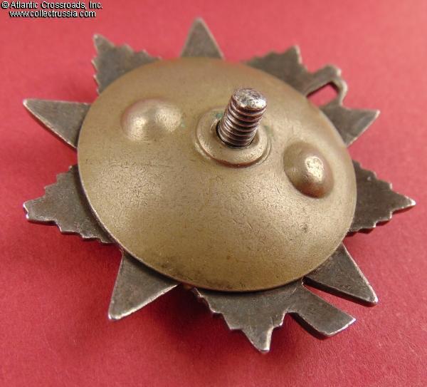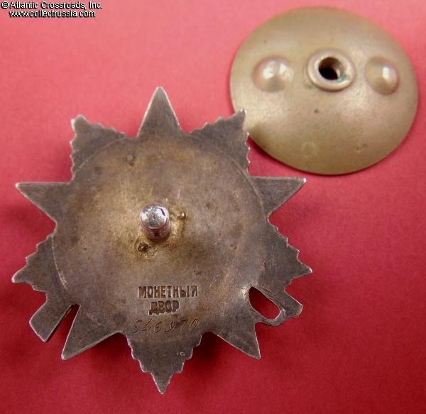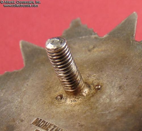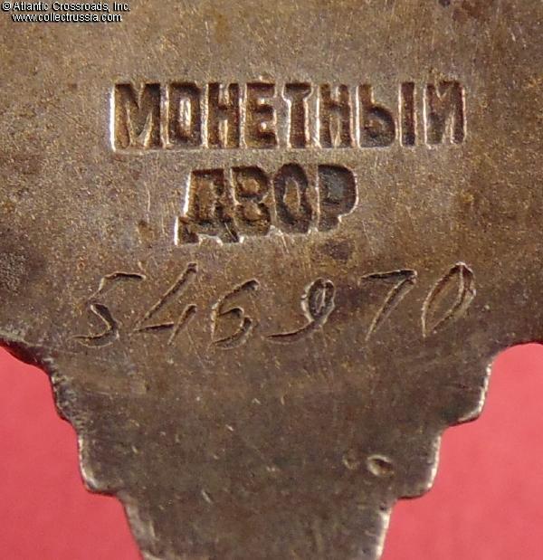 Silver, 14 K gold (hammer and sickle emblem), enamels; measures 46.2 mm tall x 44.1 mm wide; weighs 27.4 g without the screw plate. Features a relatively flat reverse and the mint mark in straight horizontal lines. This piece is from the third series of Krasnokamsk Mint "Flatbacks", manufactured in March 1945 (according to mondvor.narod.ru). In very fine to excellent condition. The enamel appears practically perfect to the unaided eye and retains a beautiful luster. A close examination with a 10x loupe reveals a single miniscule flake at the base of the 5 o'clock arm and some microscopic contact marks to the arms throughout but no significant wear. There is a very attractive even patina to silver on both sides. The screw post is full length, nearly 13 mm, and includes an original WW2-era screw plate.