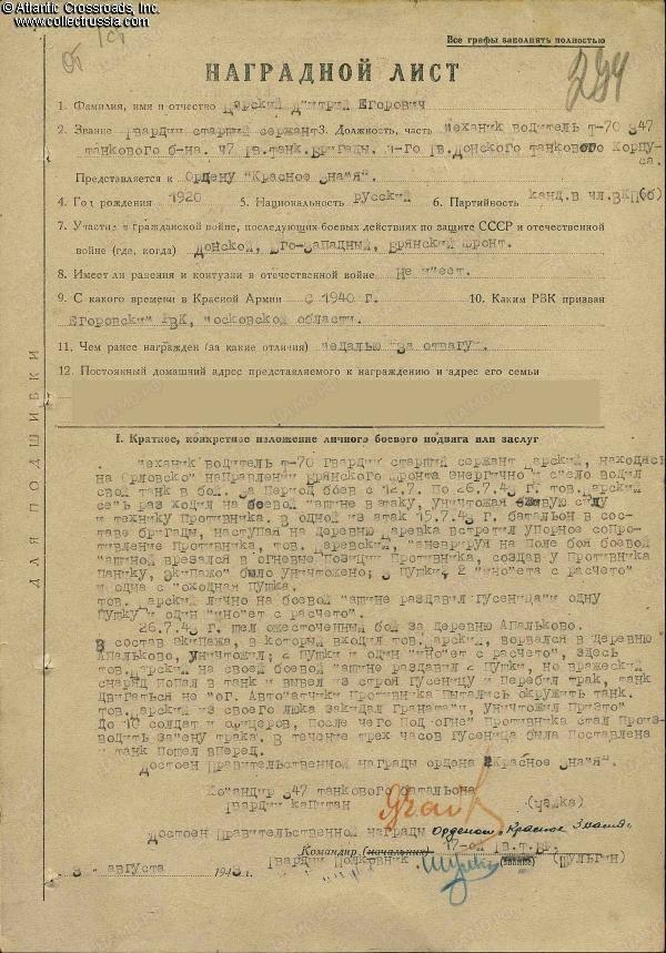 Dmitriy Tsarskiy was born in 1920 in a village of Moscow Region and drafted into the Red Army at 20 years of age, just before the Patriotic War. He was at the front lines from the first day of the war, 22 June 1941, and was wounded in December of that year. In November 1942, Tsarskiy had the rank of Sergeant and served as the driver of a T-70 light tank in the 581st Tank Battalion, 216th Tank Brigade, 5th Tank Army, Southwestern Front, engaged in the Battle of Stalingrad. At that time, the 5th Tank Army was positioned near Serafimovich on the right bank of the Don River, facing the Romanian 3rd Army and ready to attack. Once Operation Uranus, planned by Zhukov and Vasilevskiy, was launched on 19 November 1942, the 5th Tank Army quickly overran the Romanian 3rd Army which was outnumbered, poorly equipped, and stretched too thin. The lightly armed but reliable and swift T-70s were primarily designated for infantry support but were also often used for reconnaissance, and Tsarskiy distinguished himself on recon missions on 27-28 November 1942. In the commendation for the Medal for Valor, he was cited for skillful driving at maximum speed without accidents or needing help, and for bringing important information about the enemy. The medal was awarded to him on 4 December 1942, well before the end of the Battle of Stalingrad.