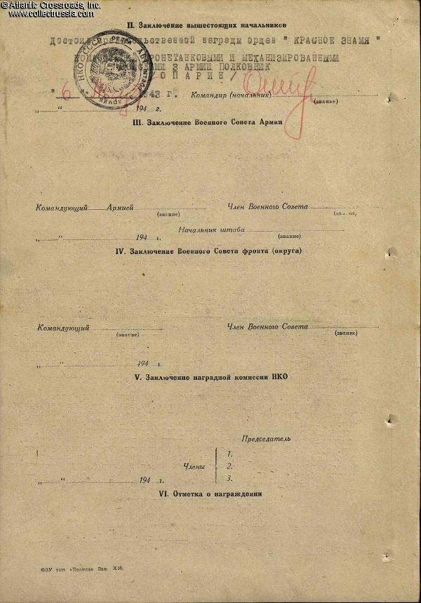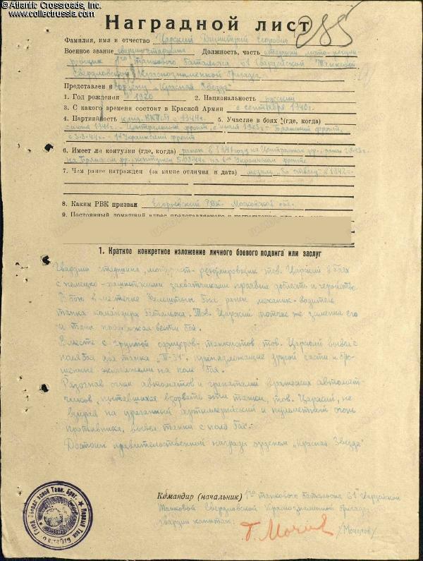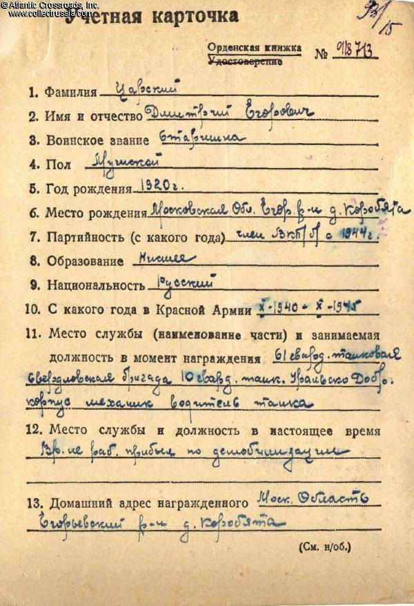 During the Upper Silesian offensive in March 1945, Tsarskiy was cited for excellent maintenance of his tank and great skills as a mechanic- driver. During the campaign, his T-34 had covered 1,250 km (777 miles) without repair. In the fighting for the city of Oppeln (modern-day Opole, Poland), his tank crew neutralized one Panzer IV tank, two armored personnel carriers, destroyed three anti-tank guns, and killed 36 enemy soldiers. For his outstanding service, Tsarskiy was recommended for the Order of the Patriotic War 2nd cl., which was awarded to him on 30 March 1945 by a general order of the 10th Guards Tank Corps.
