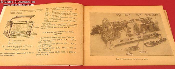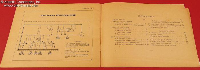 Brochure format measuring 7 ½" x 5 ½", soft cover; 34 pp. of comprehensive and very detailed instructions on the composition, setup, use, maintenance, and repair. Complete with electric diagrams and tables listing parts and components of the device.