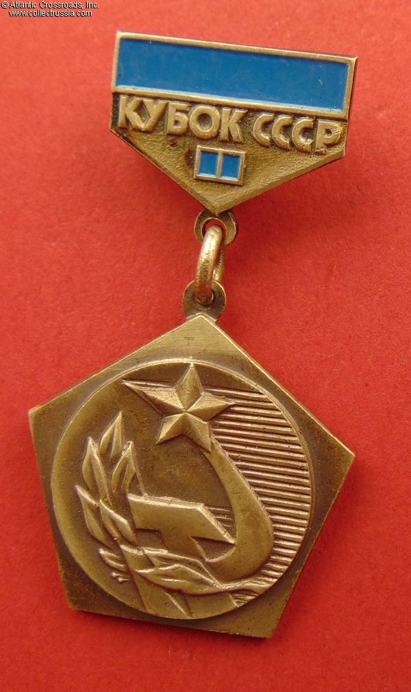 In silver plated brass; the medallion measures 31.6 mm in height incl. eyelet x 29.7 mm in width; overall height with the suspension is approx. 52 mm. The suspension has an inscription "USSR Cup". The raised inscription on the reverse of the medallion is "Committee for Physical Culture and Sports at the Council of Ministers of the USSR". A very well-made and massive piece. Excellent condition.