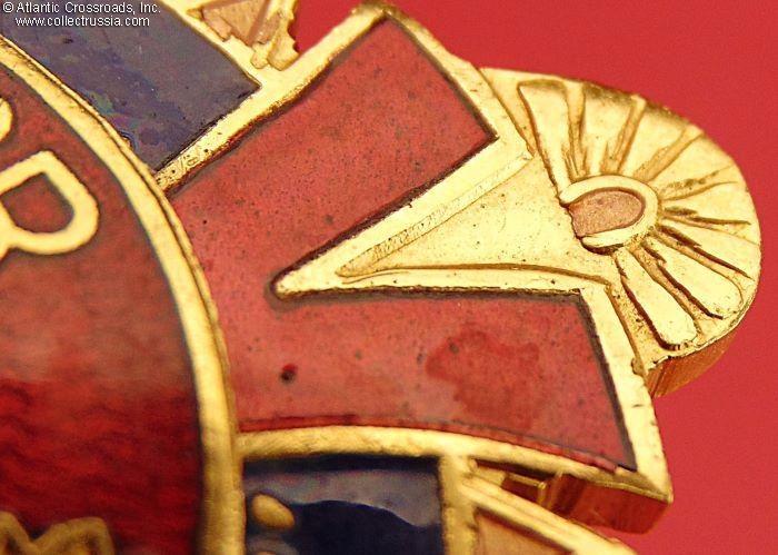 In very fine condition. A tiny indentation spot to the red enamel of the 3 o'clock arm of the cross reaching to the metal underneath and looking like it occurred while the enamel was still soft. A shallow flake to the red enamel of the 3 o'clock arm, visible only when tilting the cross to reflect a bright light. Minimal wear to the blue enamel becomes noticeable starting at 10x magnification, practica
