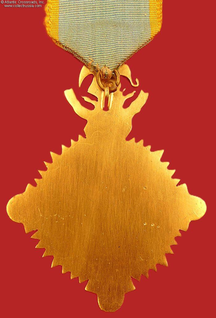 Silver gilt, enamels, 69.3 mm in height, 52.9 mm in width, weighs 32.1 g. Suspended from a threaded ribbon in moiré silk, attached to the suspension loop on the reverse of the badge.