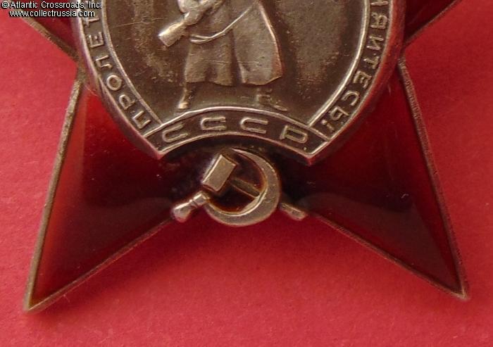 In excellent condition, absolutely outstanding for a pre-Patriotic War Soviet decoration. The enamel exhibits a beautiful luster and has only some minuscule contact marks that are barely noticeable, no chips, ribbing, flaking or repairs. The center medallion shows only a minimal wear to the high points; its details are well preserved and crisp. The reverse is nearly pristine, and there is a very attractive untouched toning to silver throughout. The screw post is full length, over 10 mm measured from its base, and comes with an original period screw plate, an early model in silver with a two-tier base.