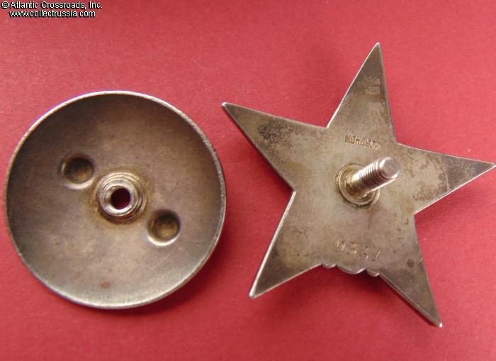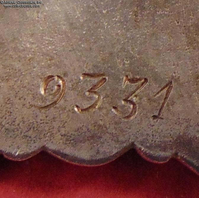Silver, enamel. Measures 46.1 mm in height, 48.1 mm in width; weighs 28.1 g without the screw plate. Features a very slightly arched, nearly straight mint mark about 6 mm wide, stamped in a relatively small font of just over 1 mm in height. The dark cherry red enamel is of spectacular quality, characteristic of the "Mondvor" Red Stars. According to The Order of the Red Star by Durov and Strekalov, the currently known serial number range for this version is 8506 - 11800 (9016 - 11682 according to Mondvor.narod.ru). The order was manufactured in 1939 at the Leningrad M