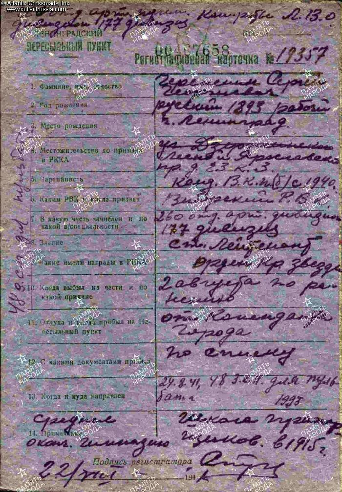 During the early days of the Patriotic War, Cheremenin was still on active duty with the 147th Rifle Regiment stationed on the Finnish border north of Leningrad. He was wounded in action in August 1941 but was again on the front lines after convalescing in the Military Hospital #1444. By the end of the year, he went missing in action / presumed killed while defending Leningrad. The Order of the Red Star earned in the Winter War remained his only decoration.