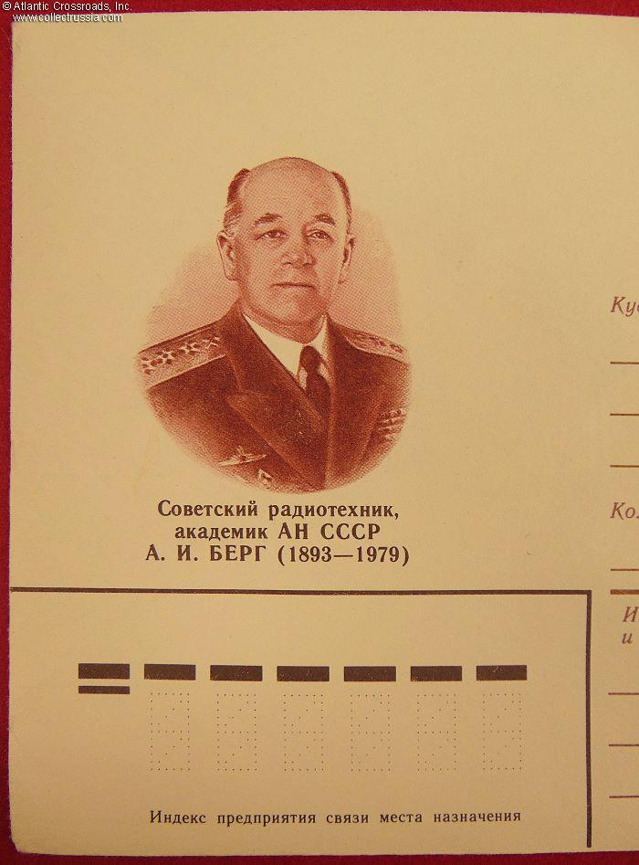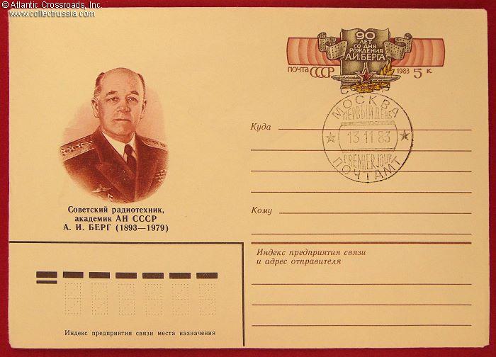 The size is 6 ½" x 4 ½", with a pre-printed special-issue postal stamp inscribed "90 years since the birthday of A.I. Berg" and canceled with the Fist Day stamp issued by the Moscow Post Office and dated 13 November 1983. Postally unused, published by the Ministry of Communications of the USSR, circulation unknown.