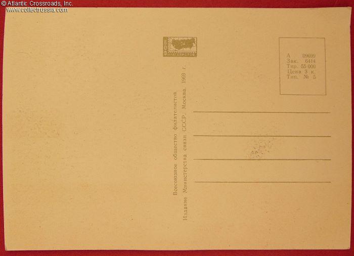 The size is 6 ½" x 4 ½", published by the Ministry of Communications of the USSR for the Soviet All-Union Philatelic Society, circulation 55,000. The obverse features a fragment of Repin's famous 1891 painting Reply of the Zaporozhian Cossacks. The special postal stamp with the same image is stamped with the First Day Cancel, issued by the Post Office of Repino, Leningrad Region, dated 5 August 1969 and showing Repin's facsimile in the center.