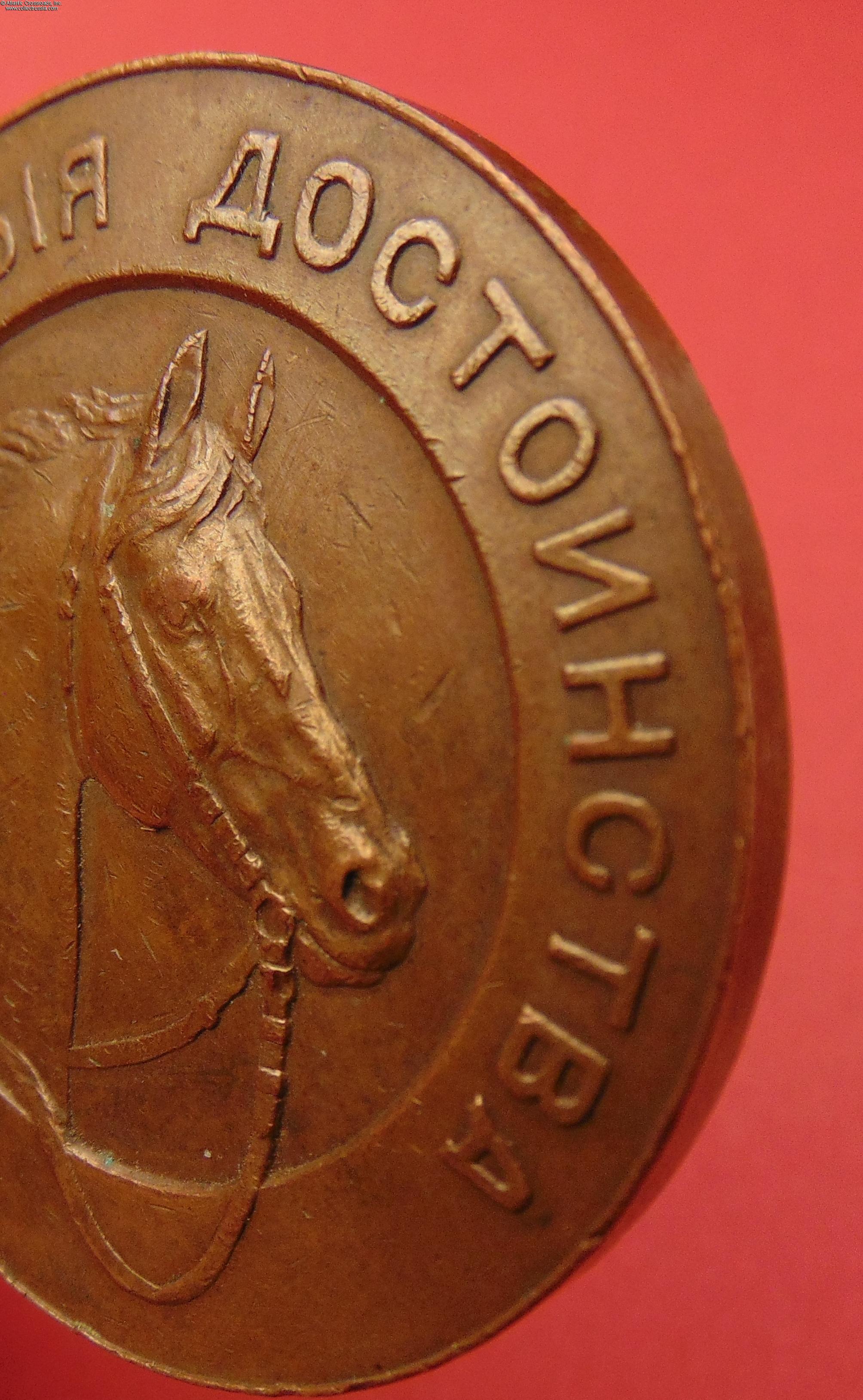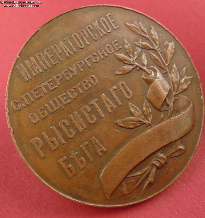 In bronze, 51.0 mm wide; weighs 56.3 g. Unsigned but the engraver is known to be A. Griliches Jr. The obverse has a nicely detailed image of a bridled horse and raised inscription "For Superior Appearance". The inscription on the reverse is "Imperial St. Petersburg Society of Trotter Racing".
