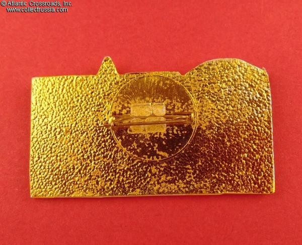 Anodized aluminum, paint, lacquer; measures 31.6 x 51.6 mm. Features the Soviet red star military insignia and Komsomol (VLKSM) member badge. Large and impressive piece in excellent condition.