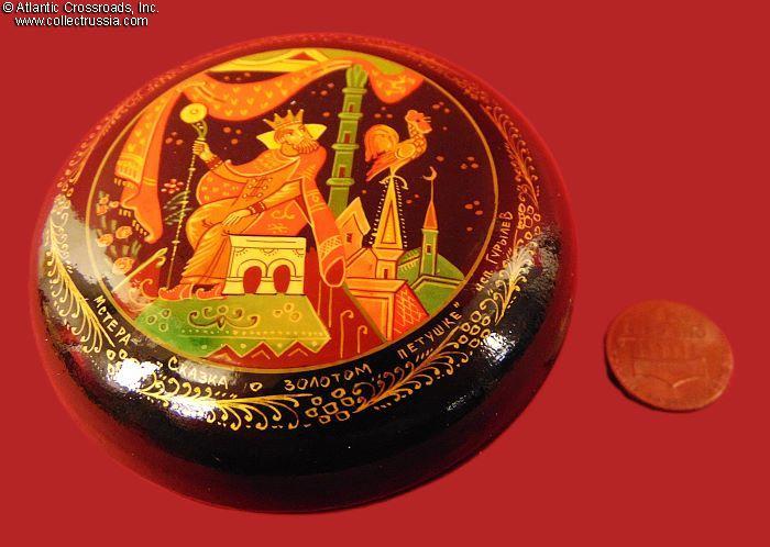 A miniature box for miniature artwork! Stands mere 33 mm tall with the lid on, 70 mm wide. Wood, oil paints, lacquer. The imagery is painted on the lid against pitch-black background, traditional for Russian folk-art miniature. The inside is in warm carmine lacquer, also typical for this art genre and tradition. The artist's signature, Gurylev, is at the bottom of the artwork after the name of the workshop and the title of the fairy tale.