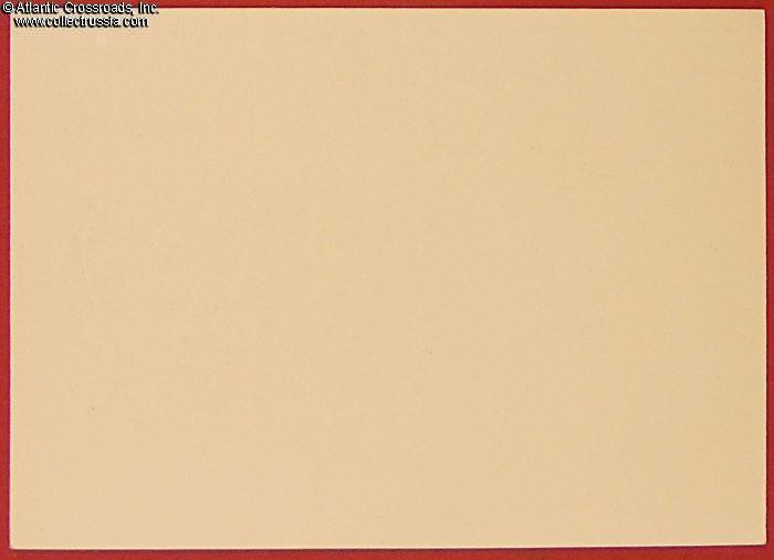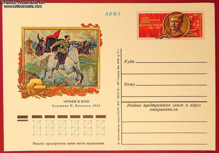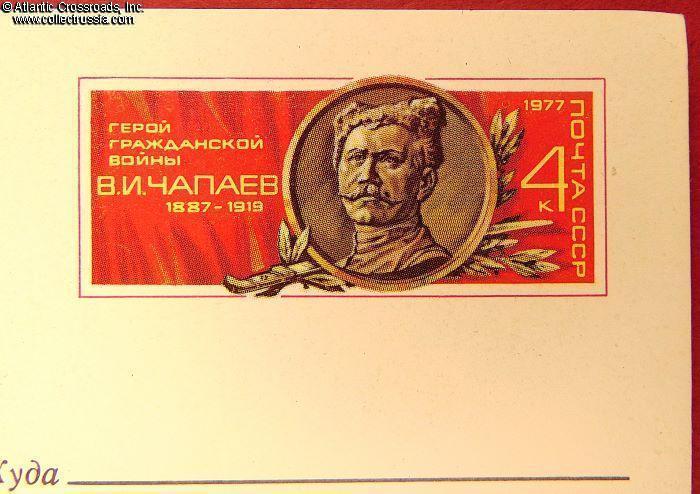 The size is continental standard 6" x 4", postally unused, with a First-Day-Cover type special-issue preprinted postal stamp showing Chapayev's head portrait and the years of his life under the inscription "Hero of the Civil War V.I. Chapayev." The artwork in the left pane is a reproduction of the 1935 (1934 according to some sources) painting by Pyotr Vasilyev Chapayev in Battle which portrays the legend of the Russian Civil War in a, let's say, "legendary" way. Galloping into attack with a burqa cape aflutter behind you looks romantic but is very impractical and dangerous. No c
