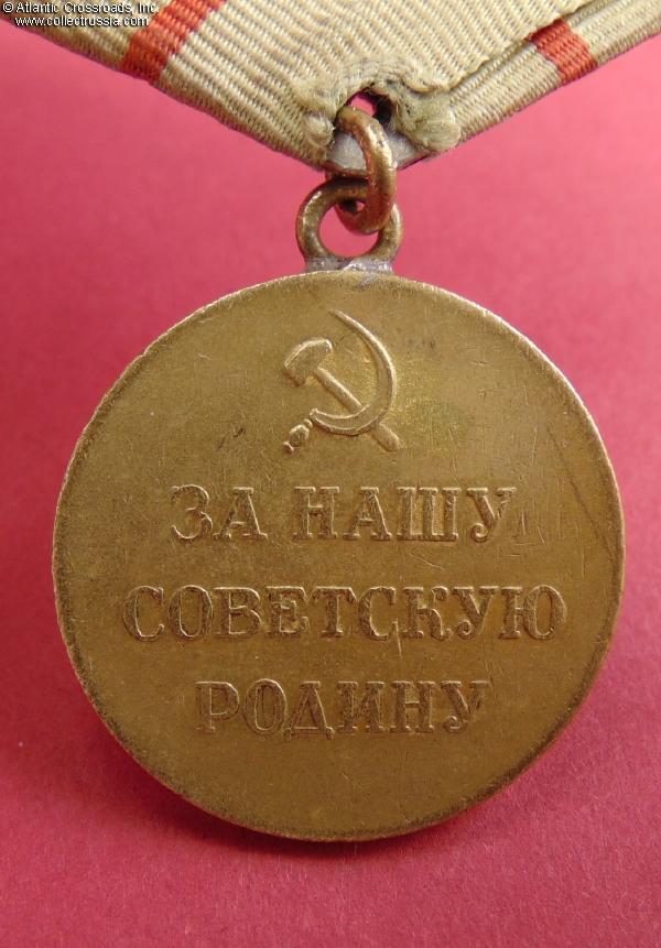 In brass; 37.6 mm in height incl. eyelet, 32.2 mm in width; weighs 16.9 g not including the suspension and connecting link. First variation of the medal featuring a separate eyelet soldered to the medallion. This particular sub-variation of the medal features a wider outer rim on the obverse and a relatively large plume of smoke billowing from the gun of the tank on the left, almost reaching the letter "O" in the inscription. The hammer & sickle emblem on the reverse does not have a small projection over the edge of the sickle above the handle that is found on another version of the Var