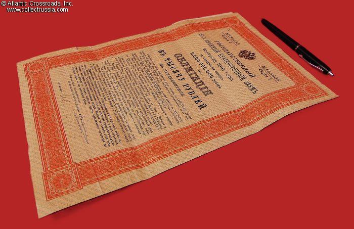 Measures 7 ¾" x 11 ¾"; two watermarked pages, with p.2 containing 20 redemption coupons of which 18 are still present. This is Imperial Russia's short-term State War Bond in 1,000 ruble denomination, guaranteeing a 5 1/2% interest rate. Series I, issued against authorized capital of 2,000,000,000 rubles, with fully attached redemption coupon fold-out which has eighteen coupons remaining. The certificate is finely engraved and printed on watermarked bank note paper, with the Imperial Russian double-headed eagle at top center. These bonds were issued to help finance the war effort in Worl