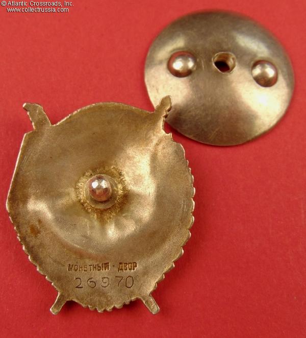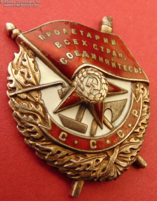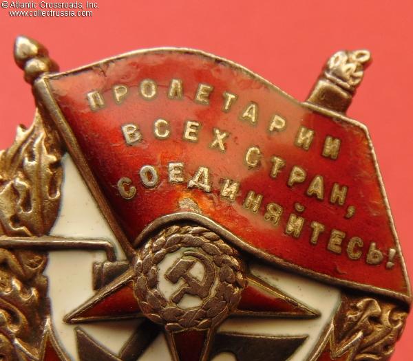 Silver gilt, enamels; measures 40.1 mm in height (from the top of the flag to the bottom of the wreath), 36.1 mm in width; weighs 23.5 g not including the screw plate. Features "geometric" style of the serial number engraving which is characteristic for its serial number range. According to Durov and Strekalov, this piece was manufactured in the early part of 1942 by the Krasnokamsk Mint. /V. Durov, N. Strekalov The Order of the Red Banner, p. 126/.