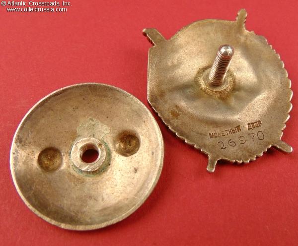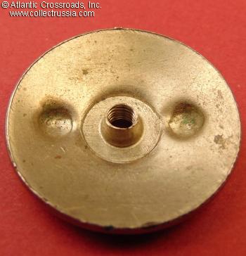 In very fine condition, well above the average for the screw back type. The enamel on the banner in particular is far better preserved than usual, having no significant losses: there is only a single tiny chip at the lower edge of the banner immediately above the central star and some relatively minor scratches and surface flakes, mostly along the edges. The red enamel on the star and plaque with "CCCP" has only surface flaking, no chips penetrating to silver; overall, both the star and plaque appear almost completely intact to the unaided eye. The white enamel has only a microscopic amount of surface flaking in the center medallion, invisible to the naked eye - otherwise perfect.
