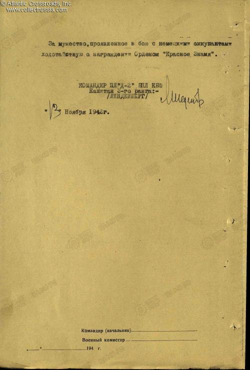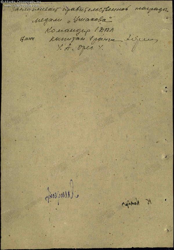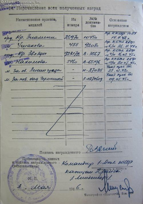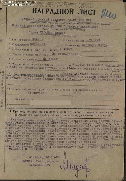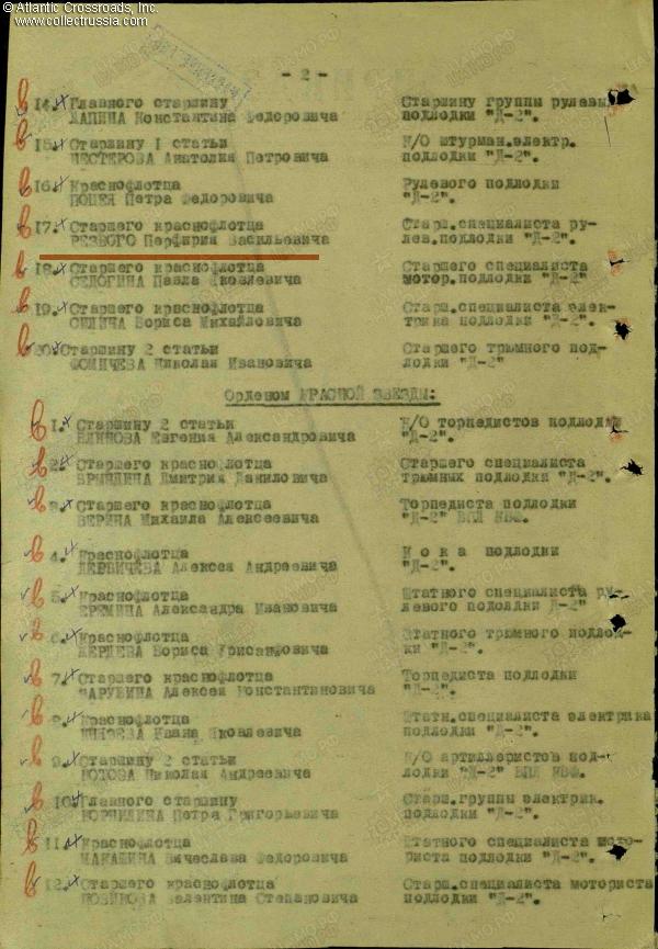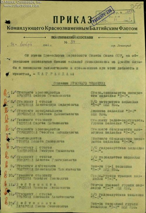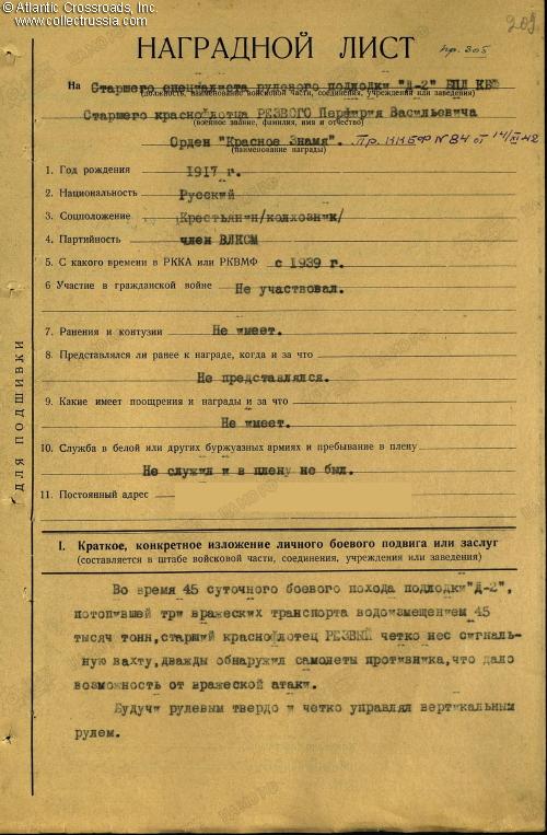 Research Materials: b/w copy of the award record card, award commendations for all four wartime decorations, and relevant part of the award decree for the Order of the Red Banner. Ample information about the D-2 and many photos can be found on a number of Russian- language websites such as ru.wikipedia.org and sovboat.ru.