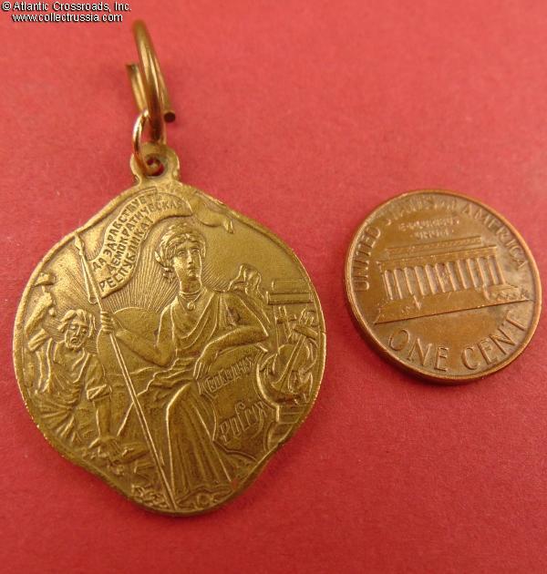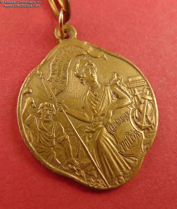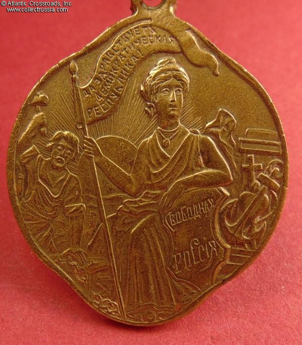 In brass, 32.9 mm tall (incl. eyelet), 25.9 mm wide. The complex shape is less common than the more typical round jettons. The obverse is dominated by a sitting female figure; her chair is inscribed "Free Russia" whereas the flag she is holding in the right hand has the motto "Long Live the Democratic Republic!" To the left of the figure of Russia is a worker breaking her chains on an anvil. A curious feature of this jetton is the maritime motif in the lower right consisting of an anchor, heart and cross. This possibly indicates that the jetton was intended for sailors or port w