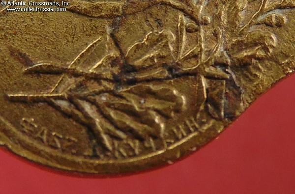 In brass, 32.9 mm tall (incl. eyelet), 25.9 mm wide. The complex shape is less common than the more typical round jettons. The obverse is dominated by a sitting female figure; her chair is inscribed "Free Russia" whereas the flag she is holding in the right hand has the motto "Long Live the Democratic Republic!" To the left of the figure of Russia is a worker breaking her chains on an anvil. A curious feature of this jetton is the maritime motif in the lower right consisting of an anchor, heart and cross. This possibly indicates that the jetton was intended for sailors or port workers. The reverse shows the 1917 date, intricate florals, and the manufacturer's logo "D. Kuchkin Factory, Moscow".