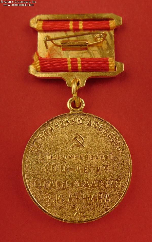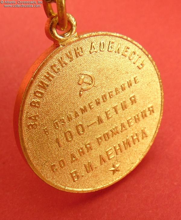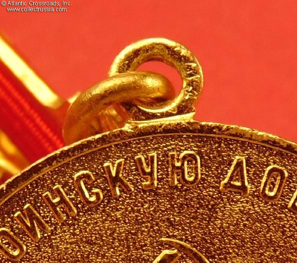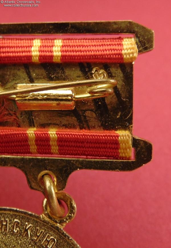 In brass; 32.1 mm wide. The reverse side of the eyelet shows the stamped mint mark "LMD" (Leningrad Mint). The reverse of the suspension shows a stamped maker mark of one of several Soviet factories that subcontracted production of medal suspensions for the mint.