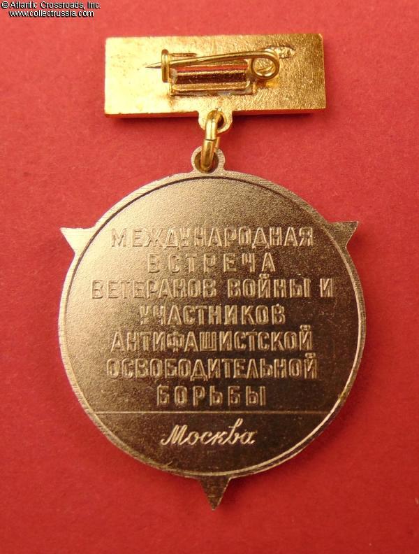 The medal is in brass with silver-plating, gilt, and enamels. The quality is superb throughout. The medallion measures 35.8 mm tall (incl. eyelet), 30.2 mm wide. An interesting and unusual artwork featuring a Latin "V" for Victory, a clear indication that many of the medals were intended for foreigners, some of whom came from the western countries. The reverse has a raised inscription "International Conference of Veterans of War and Participants of Antifascist Liberation Struggle. Moscow". The enamel on the suspension is royal blue (incidentally, a traditional color of Soviet S