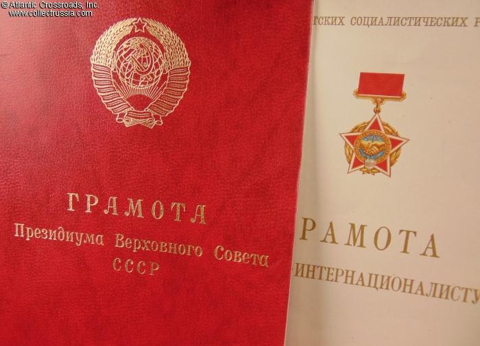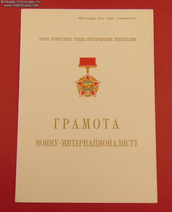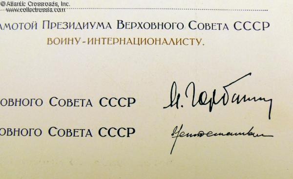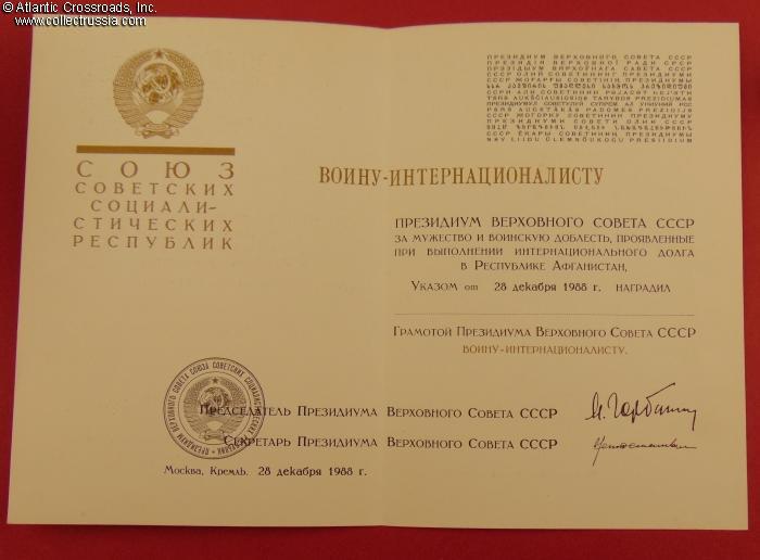 Large document enclosed in 6 1/4" x 8 3/4" red folder with gold lettering on the front cover. Shows an image of the badge in color and the citation from the Soviet government "for courage and military valor shown during the execution of international duty in the Republic of Afghanistan." At the bottom of the citation page are facsimile signatures of the Chairman of the Presidium of the Supreme Soviet of the USSR Mikhail Gorbachev and Secretary of the Presidium Menteshashvili. Also shows a typographically printed seal of the Supreme Soviet and the 20 December 1988 date of the award decre