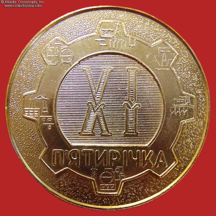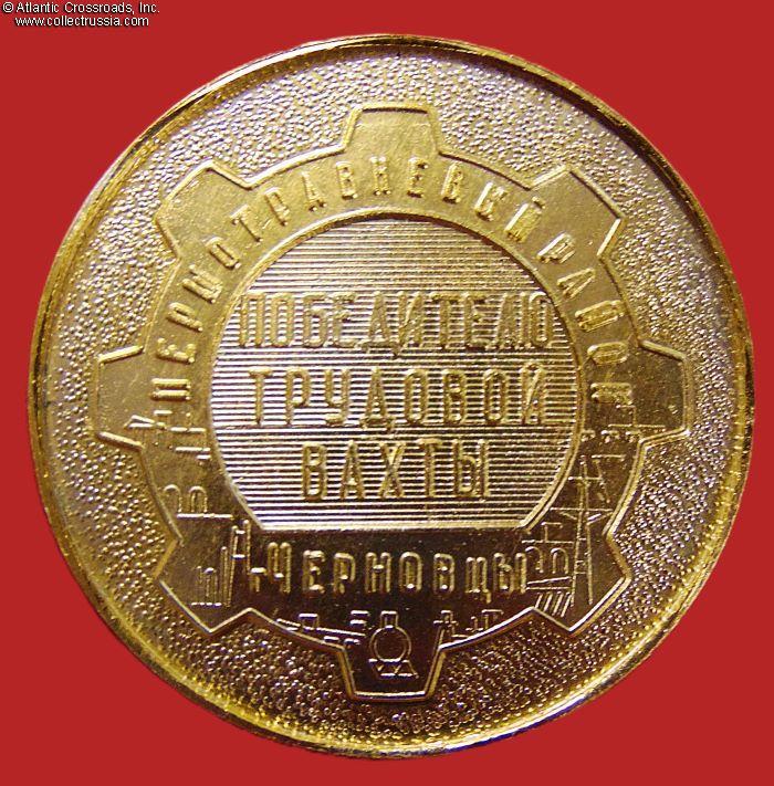 In light metal alloy with gold-colored coating; measures 60 mm across, 3.4 mm thick, weighs 21 g. The lettering in the center of the obverse reads, loosely translated, "To the winner of labor competition, Pervomajskiy District, city of Chernovtsy." The reverse is decorated with industrial symbols surrounding the "XI Five-Year Plan" inscription in Ukrainian language.