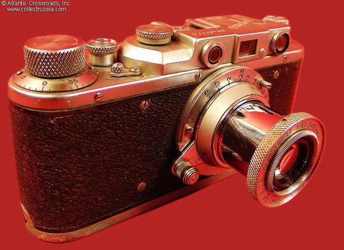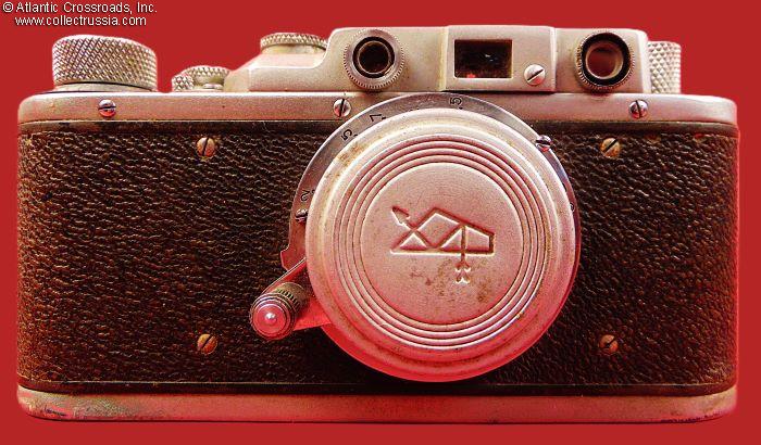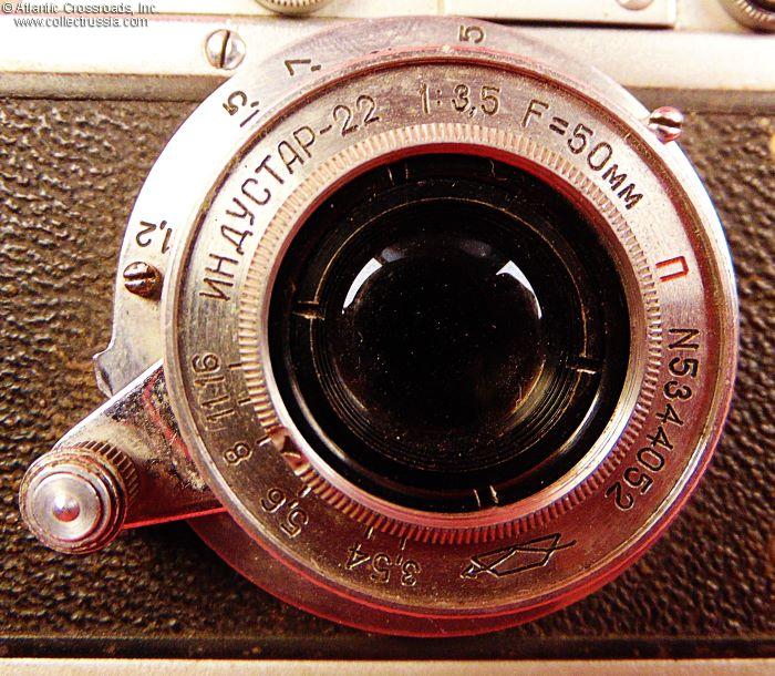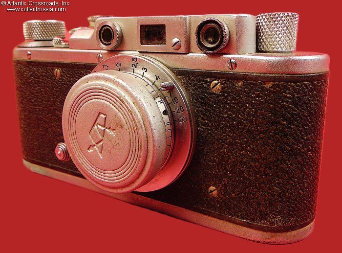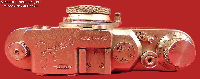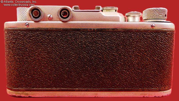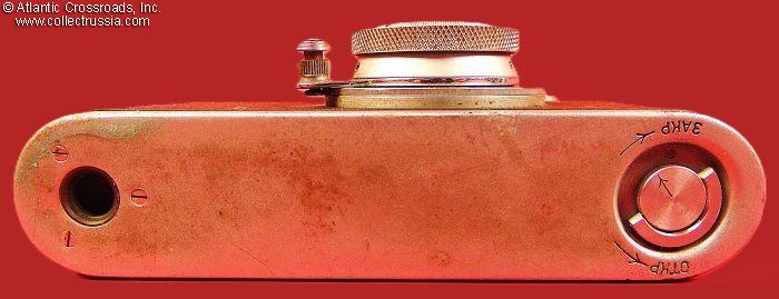 The camera measures approx. 5 ¼" (W) x 2 ¾" (H) x 2" (D, with the lens collapsed and lens cap on). Weight is a little over 1 lb. This is the first model of the Zorki camera, which did not have the number "1" next to the brand name. Two things allowed us to narrow down the years of manufacture: (1) the threaded opening in the shutter release button which appeared in 1949, and (2) the serial number format changed to seven digits in 1953. The Dove prism, the logo of the Krasnogorsk Mechanical Factory is applied in three places: on the top of the camera, on the lens, and stamped in the cent