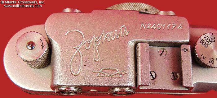 The camera measures approx. 5 ¼" (W) x 2 ¾" (H) x 2" (D, with the lens collapsed and lens cap on). Weight is a little over 1 lb. This is the first model of the Zorki camera, which did not have the number "1" next to the brand name. Two things allowed us to narrow down the years of manufacture: (1) the threaded opening in the shutter release button which appeared in 1949, and (2) the serial number format changed to seven digits in 1953. The Dove prism, the logo of the Krasnogorsk Mechanical Factory is applied in three places: on the top of the camera, on the lens, and stamped in the center of the lens cap.