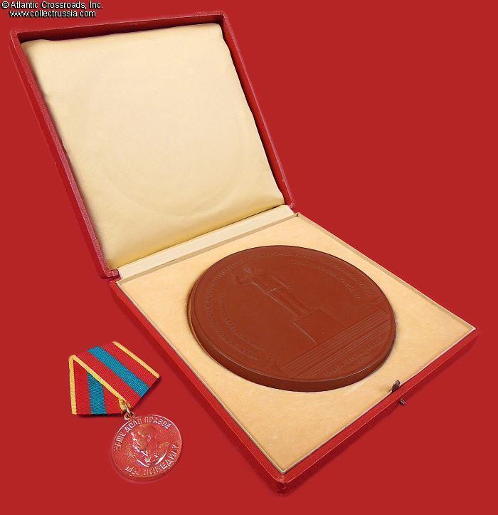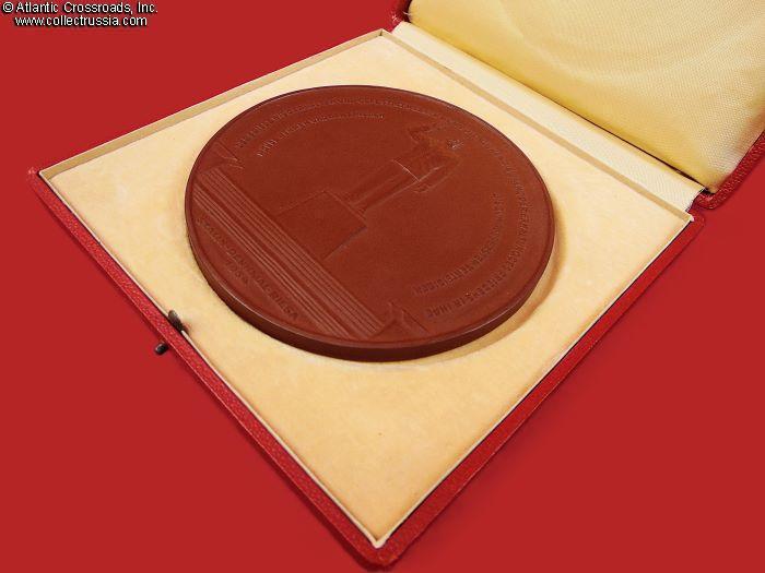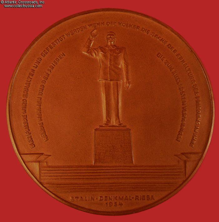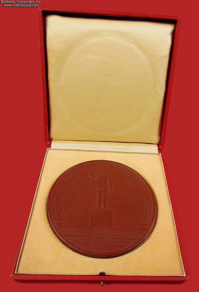 The plaque measures 12 cm across, approx. 7 mm thick, in brown porcelain. The artwork is an image of the monument to Stalin erected in the town of Riesa, Meissen District, Saxony. In 1954, it was perhaps one of the last expressions of Stalin's personality cult. The lettering running along the rim of the plaque is one of Stalin's Orwellian masterpieces, reading "Peace will be preserved and strengthened if the people take the cause of preserving peace into their own hands and defend peace to the utmost." The reverse is plain, with the raised trademark of Meissen Porcelain in the center.
