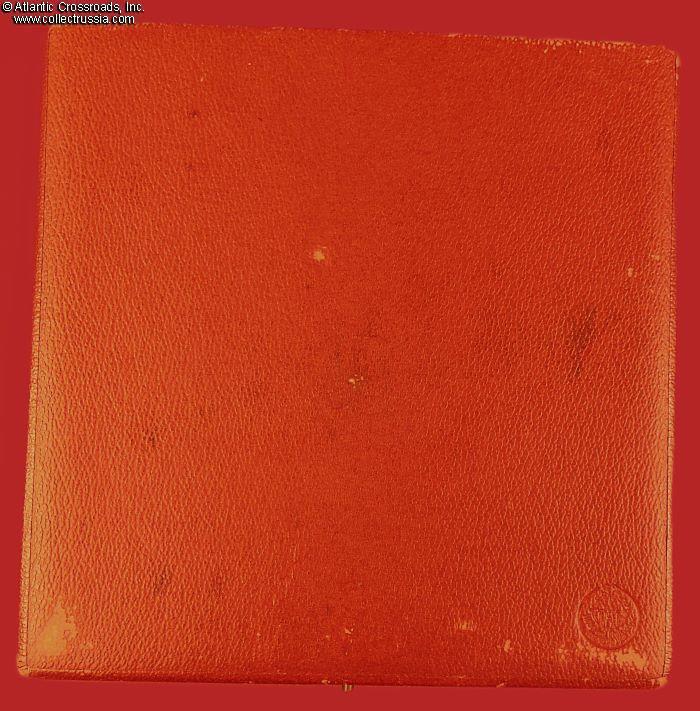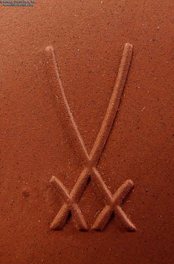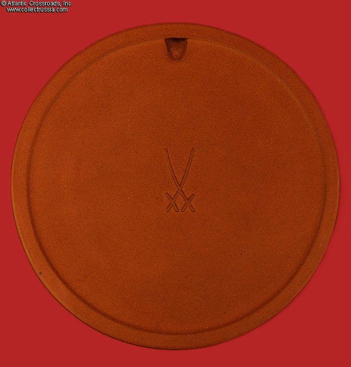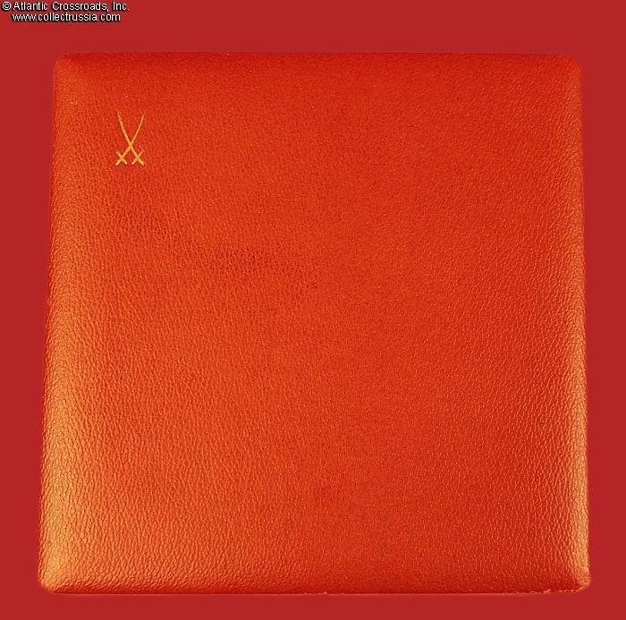 The plaque comes in its original fitted presentation box, also marked with the crossed swords of Meissen Porcelain on the lid. The box is in sturdy cardboard finished in red imitation-leather textured paper on the outside. The lid is lined in padded gold-colored silk; the fitted space is finished in short-pile synthetic velvet. The box manufacturer's mark is embossed in the corner on the bottom of the box.