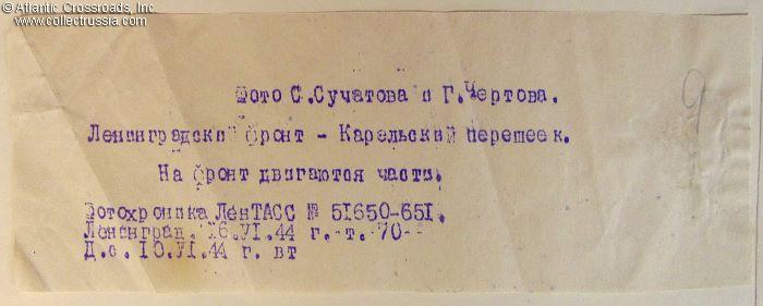 This is a panorama consisting of two photos "stitched" together. The archival paper tag glued to the verso states that the photo was taken by S. Suchatov and G. Chertov at the Karelian Isthmus, Leningrad Front, on 16 June 1944.
