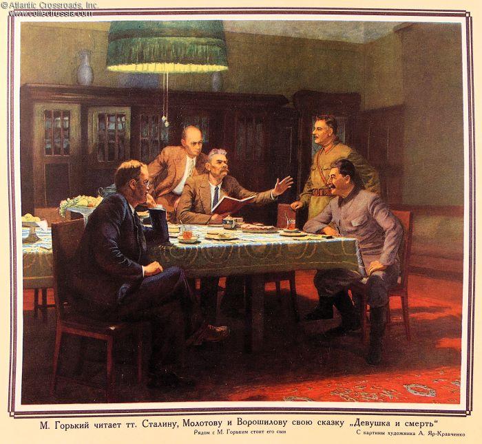 Poster Soviet Literature, with offset print of painting by Yar-Kravchenko depicting Maxim Gorky reading his poem The Maiden and Death to Stalin, Molotov, and Voroshilov.