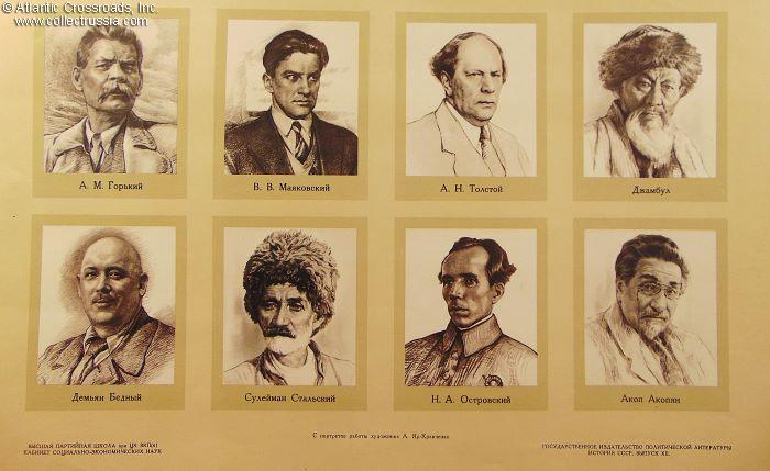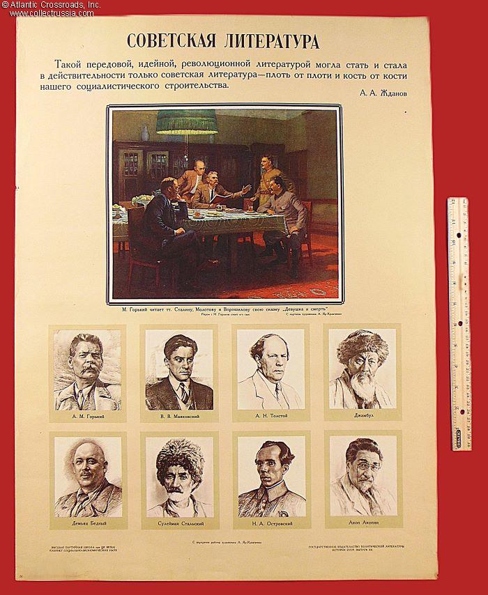 Large format measuring 20 ¼" x 27", printed on thick sturdy cardboard-like paper. Published by the State Publishing House of Political Literature, circulation unknown. The poster is part of the 12th edition of a large series of propaganda visual aids in 14 editions, entitled History of the USSR published from 1939 until 1952. The text under the header belongs to Andrei Zhdanov, Soviet politician and "propagandist-in-chief," responsible for developing the Soviet cultural policy. It says "Only Soviet literature could and did become in reality so forward, ideological and revolutionary, - flesh of the flesh, bone of the bone of our socialist creation."