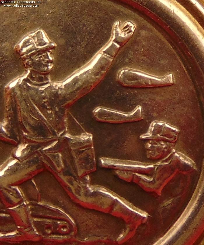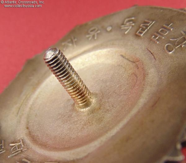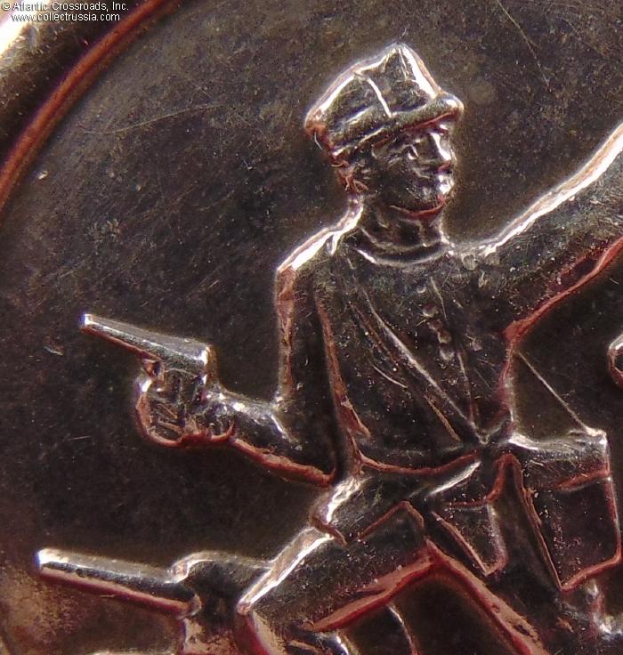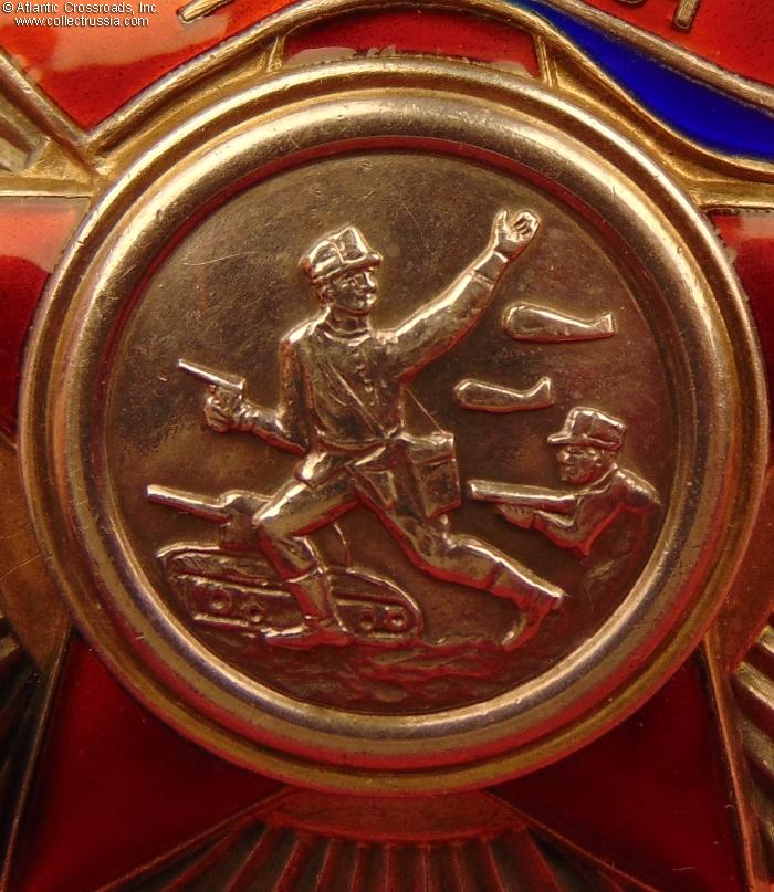 In outstanding, excellent condition. The enamel on both the banner and star is literally pristine, free of any wear that could be found even with a 10x loupe. The center medallion is essentially pristine and has only some microscopic contact marks that are not easy to find even under magnification; the raised details are perfect and exceptionally crisp. The original fire gilt finish on the middle disc of the starburst is extremely well-preserved and bright. There is a very attractive even patina to silver on both sides. The screw post is full length, nearly 14.5 mm, and comes with an original Soviet screw plate in Neusilber (white metal alloy) which is of the period and correct for this decoration. To summarize, this is an absolutely superb example of the early Order of Freedom and Independence, one of the best - if not the best - we have ever offered for sale and in our opinion, impossible to upgrade.