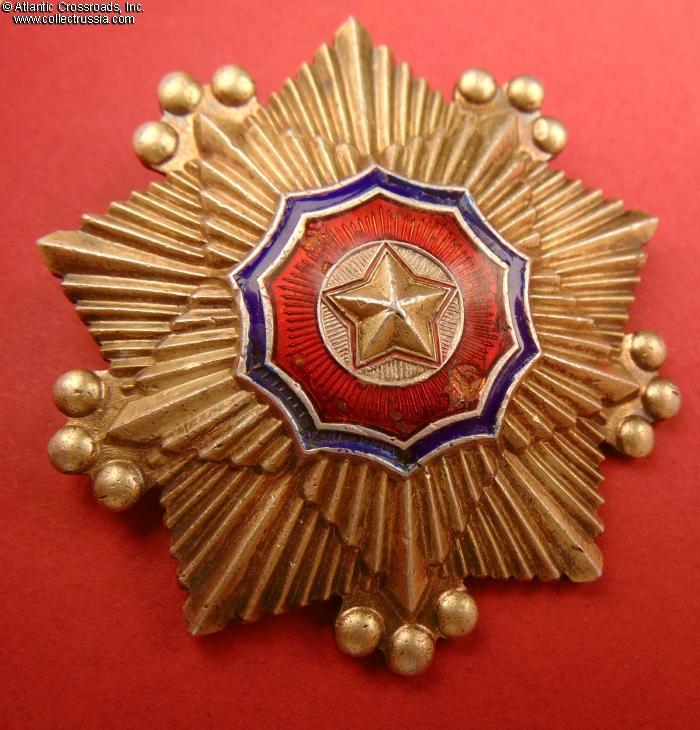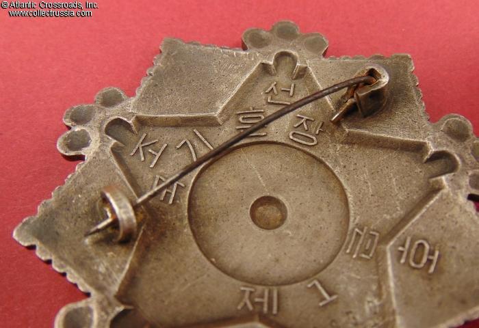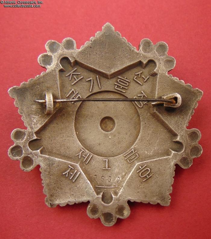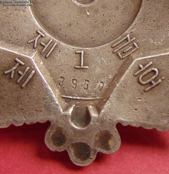 Silver gilt, enamels; measures 62.1 mm in height, 59.2 mm in width; weighs 62.2 g. Features a star counter-relief on the reverse with a sharp round depression in the middle and a horizontal pin attachment. The overall quality of this piece and especially its enamel point out that this version of the order was manufactured outside of North Korea at a location other than the Soviet Mint, believed to be in Czechoslovakia. Note the extremely low serial number, near the bottom of the currently known serial number range for its type (3835 - 8345).