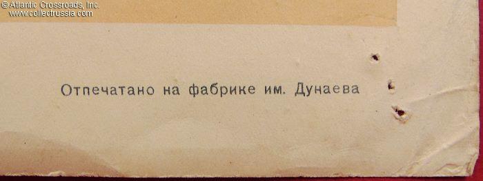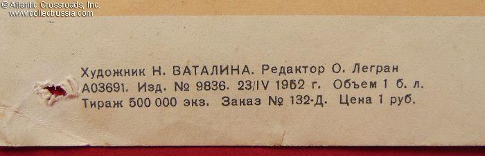 Very large format measuring 26" x 37", published by the ART Publishing House, circulation 500,000. The artist's name, N. Vatalina, is misspelled at the lower left-hand corner under the image. Her hand signature, presumably spelled correctly, Vatolina, is in the lower right-hand corner of the image. The lettering under the graphics reads "Long Live the Great Party of Lenin-Stalin, Brain, Honor, and Conscience of Our Epoch!" The tome of "History of the All-Union Communist Party (of Bolsheviks)" the fanatic with the banner is holding next to his heart quite possibly holds the world record of the number of editions a book underwent. Originally published in 1938, it underwent over 300 reprints by 1958 with changes to fit the ever fluid and constantly re-written official Party view of itself, its past, and the country it ruled. The simplified and generalized version of the slogan in this poster, "The Party is the Brain, Honor, and Conscience of our Epoch," continued to plague the Soviet people from the walls of buildings and newspaper pages all the way until the bitter end of the Soviet Union.