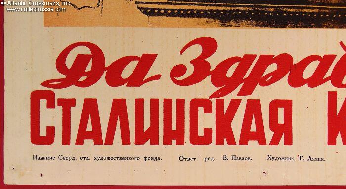 Measures 17" x 23", a scarce "local" publication by the Sverdlovsk chapter of the Artists' Fund with a very small circulation of just 10,000 copies. The large print under the graphics says "Long Live the Stalin Constitution!" The smaller print on the banner is a lengthy quote from Stalin, attributing the victory in the Patriotic War to the virtues embedded in the Constitution of 1936, commonly known as the "Stalin Constitution." The sinister coal-black figure of Stalin is a great match for the meaning of the quotation. It says, "Having walked the path of struggles and deprivations, it is nice and joyful to have our own Constitution reflecting the fruits of our victories. It is nice and joyful to know what it was that our people fought for and how they achieved their historical global victory. It is nice and joyful to realize that the blood spilled by our people was not spilled in vain, that it yielded its results."