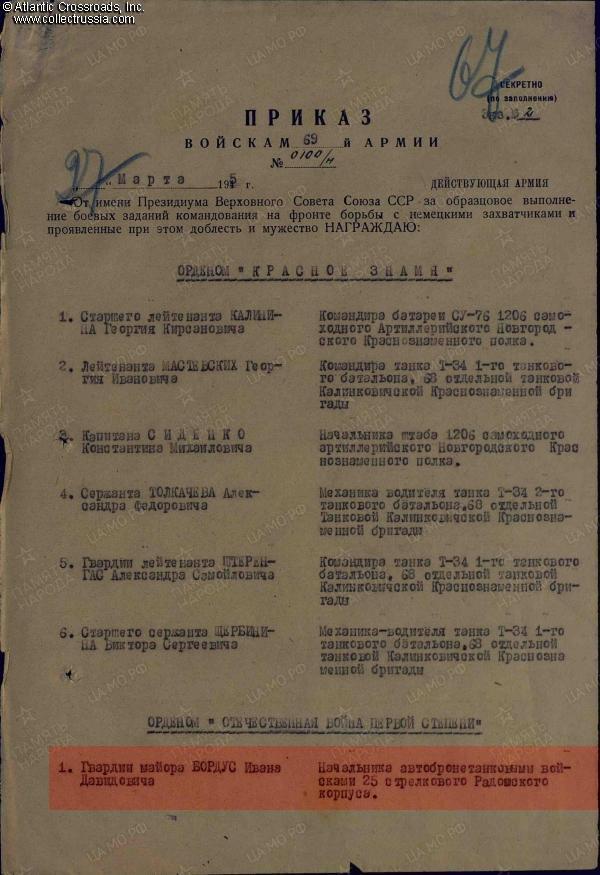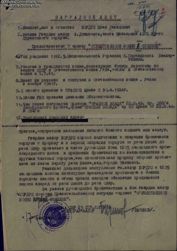 In January 1945, Bordus had the rank of Major and served as commander of the automobile and armored troops of the 25th Rifle Corps, 69th Army. In the Soviet winter offensive from the Vistula to the Oder which spelled doom to the German forces on the Eastern Front, Bordus personally directed the actions of the 1025th Self-propelled Artillery Regiment and additional armor attached to it. In close coordination with the other units of the corps, the 1025th pierced the enemy defense on the left bank of the Vistula near the town of Kazimierz Dolny. Building on its success, the 1025th relentlessly pursued the enemy, clearing a corridor which allowed the infantry to advance all the way to the Oder. For his skillful leadership and command of the armored units in battle, Bordus was recommended for the Order of the Patriotic War 1st cl. which was awarded to him on 27 March 1945.