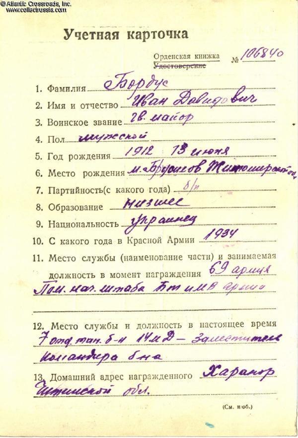 Ivan Bordus was born in 1912 in a small settlement in Zhitomir district of the Volyn Province of the Russian Empire, modern-day Ukraine. He joined the Red Army in 1934 and became a cadre officer. He fought on the front lines of the Patriotic War almost from the start, from 1 July 1941. In the early period of the war Bordus served with the Western Front and later, with the Stalingrad Front as a KV heavy tank company commander. He and his tank crew were credited with destroying an enemy tank, two motor vehicles, an antitank gun, and up to a platoon of enemy soldiers, while the company he commanded destroyed a total of five enemy tanks, six antitank guns, and 12 trucks, and eliminated up to a company of enemy soldiers.
