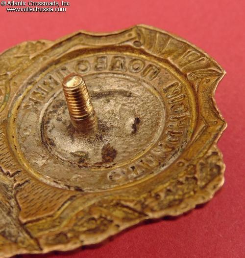 The details of the submarine and wreath are perfect and exceptionally crisp, exhibiting no noticeable wear even to the high points. There is very attractive even toning to the brass on both sides, no blemishes or oxidation spots. Some of the fragile original silver finish on the reverse is still visible in the central area around the screw post. The screw post has been marginally reduced for convenience, but its remaining length of over 9 mm is more than enough to ensure proper functionality. The screw post has also been re-threaded in its upper portion to accommodate an early post-war screw plate of the Pobeda Factory which now fits the screw perfectly.