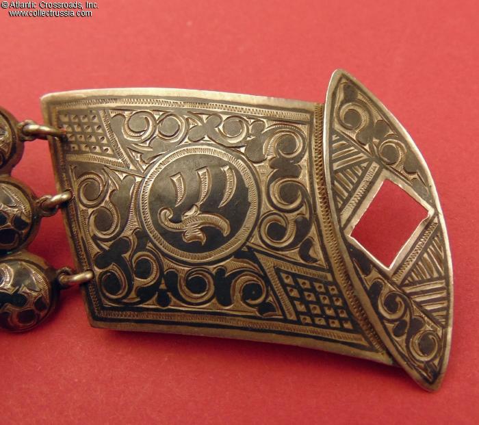 Measures 27" long, 1 3/4" wide; weighs 120.4 g (3.87 Troy Ounces). This delightful example of pre-Revolutionary craftsmanship is intricately designed and wonderfully executed in the ever-popular Caucasian national style by a silversmith in the capital of the Russian Empire. All of its larger elements are covered with niello artwork in the traditional Kubachi style. The buckle includes a small clasp in the shape of a Caucasian dagger designed to hold the halves together and attached by a chain to one of its halves. Both halves of the buckle show a Kokoshnik 84 silver hallmark with the Greek character "Alpha", the official designation of the St. Petersburg assay inspection.
