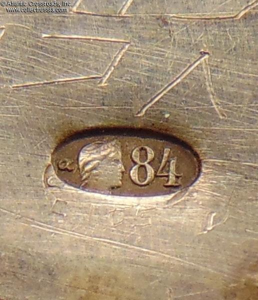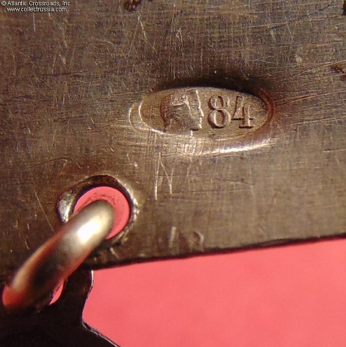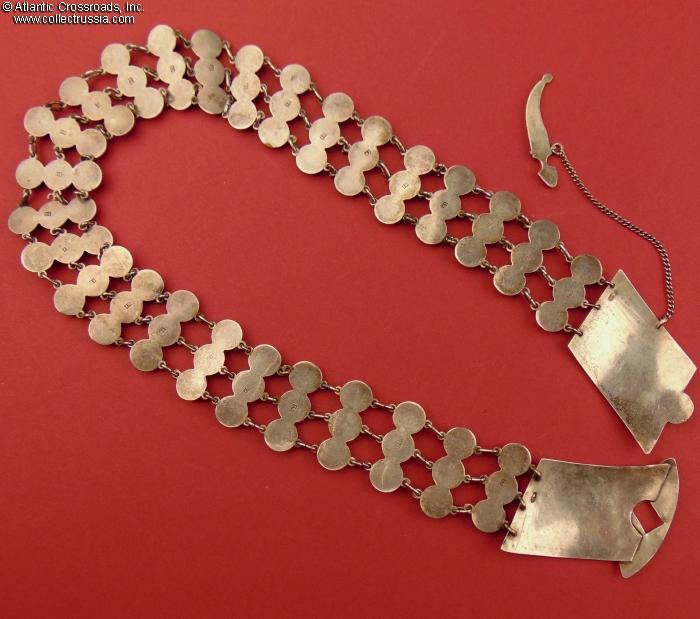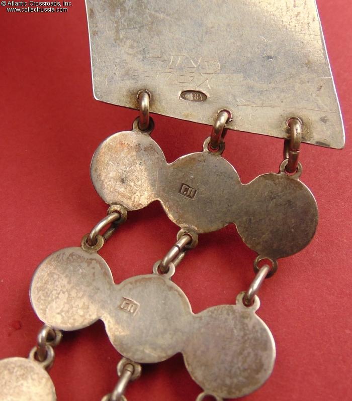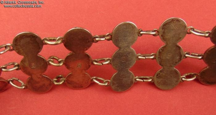The reverse of each of the 26 larger links is comprised of three semi-spherical elements and bears the maker mark ГП ("GP") of silversmith Grigoriy Pankratyev. (Pankratyev's workshop operated in St. Petersburg starting from 1874. He is known to have produced high-profile silver articles for some of St. Petersburg churches. A silver cigarette case by this master is currently in the permanent collection of Moscow's GIM National History Museum /Russian Gold and Silverwork from the 15th to 20th Century , Postnikova-Loseva et al, C. 1995, Page 181, Fig. 1261/)