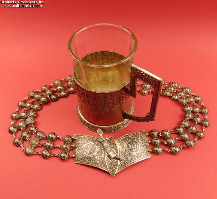 Measures 27" long, 1 3/4" wide; weighs 120.4 g (3.87 Troy Ounces). This delightful example of pre-Revolutionary craftsmanship is intricately designed and wonderfully executed in the ever-popular Caucasian national style by a silversmith in the capital of the Russian Empire. All of its larger elements are covered with niello artwork in the traditional Kubachi style. The buckle includes a small clasp in the shape of a Caucasian dagger designed to hold the halves together and attached by a chain to one of its halves. Both halves of the buckle show a Kokoshnik 84 silver hallmark wi