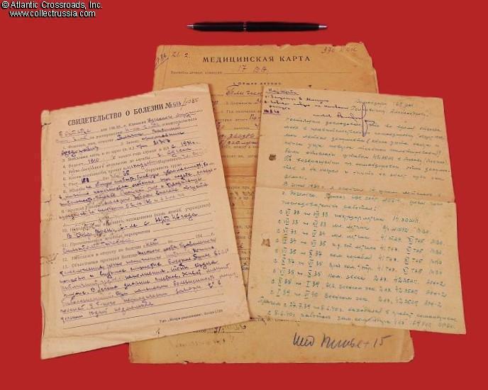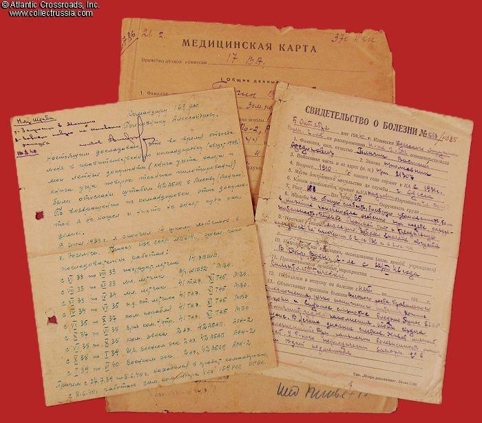 Health Status Report, 5 October 1946, completed by a commission of the Odessa Military District hospital. By that time Pligin had the rank of lieutenant colonel and, judging by the commission's findings, was not in good health. Complaints included weakness, fatigue, pains in his legs, irritability, and some others. Bloodwork showed traces of typhus and malaria. Based on their findings, the commission prescribed a month-long furlough which was approved by the Medical Commissar of the Odessa Military District.