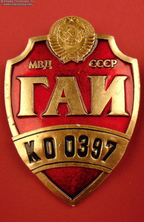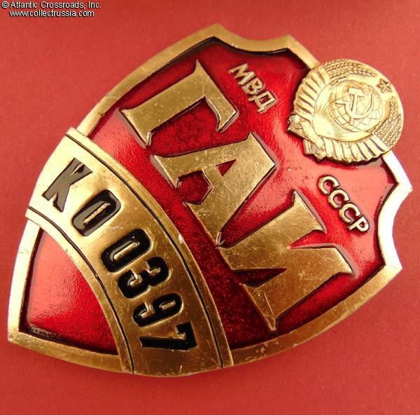 Aluminum, paint, lacquer. Large red shield measuring 99.5 mm (nearly 4") in height, 70.5 mm in width. Shows Cyrillic letters ГАИ ("GAI", abbreviation for the State Automobile Inspection) in the center and Soviet national emblem on top. The plaque with an individual identification number "MA7723" is a separate superimposed part. On the reverse near the top there is a raised Soviet-era trademark of the Poltava Dinamo Factory, Ukraine.